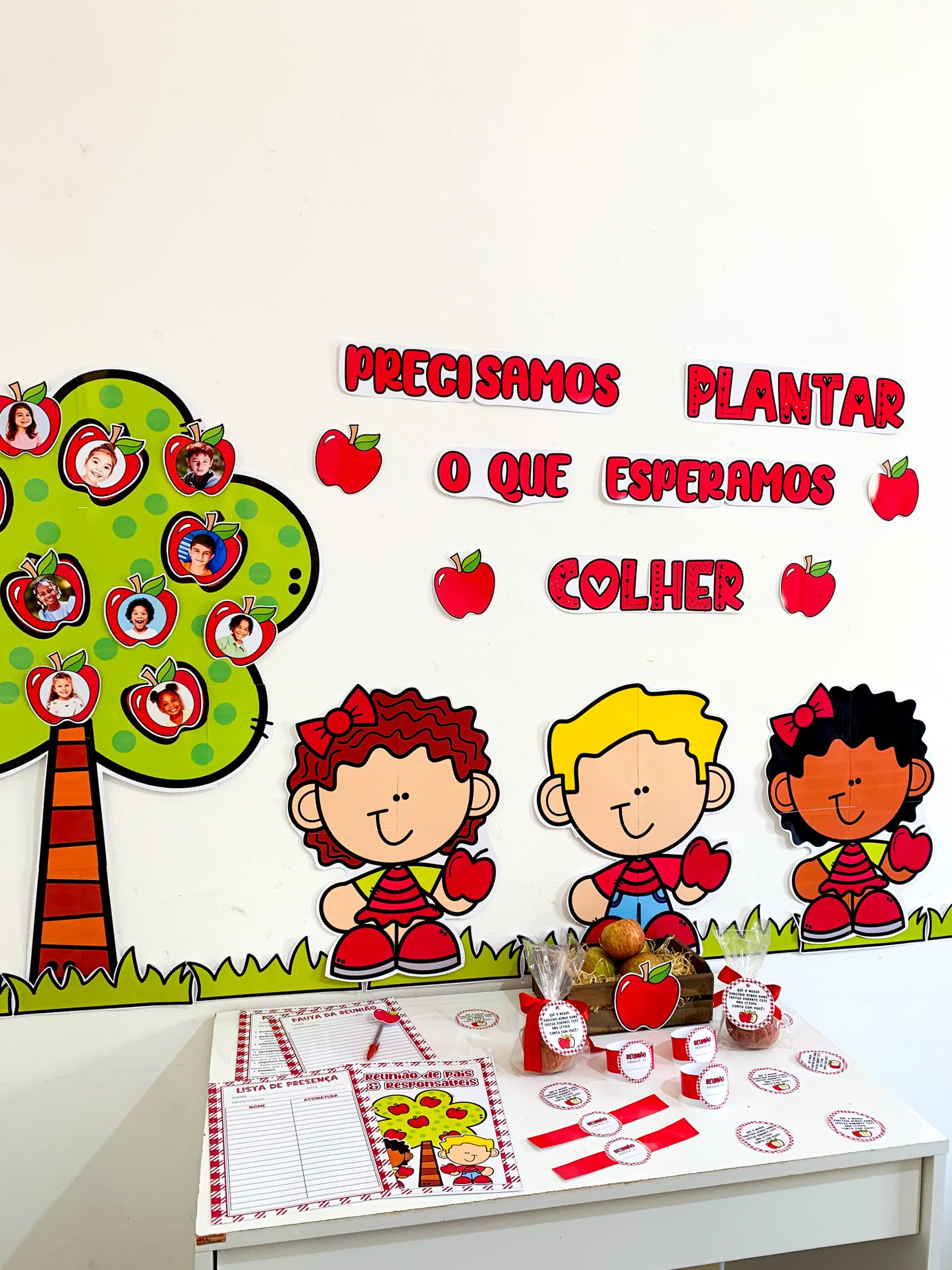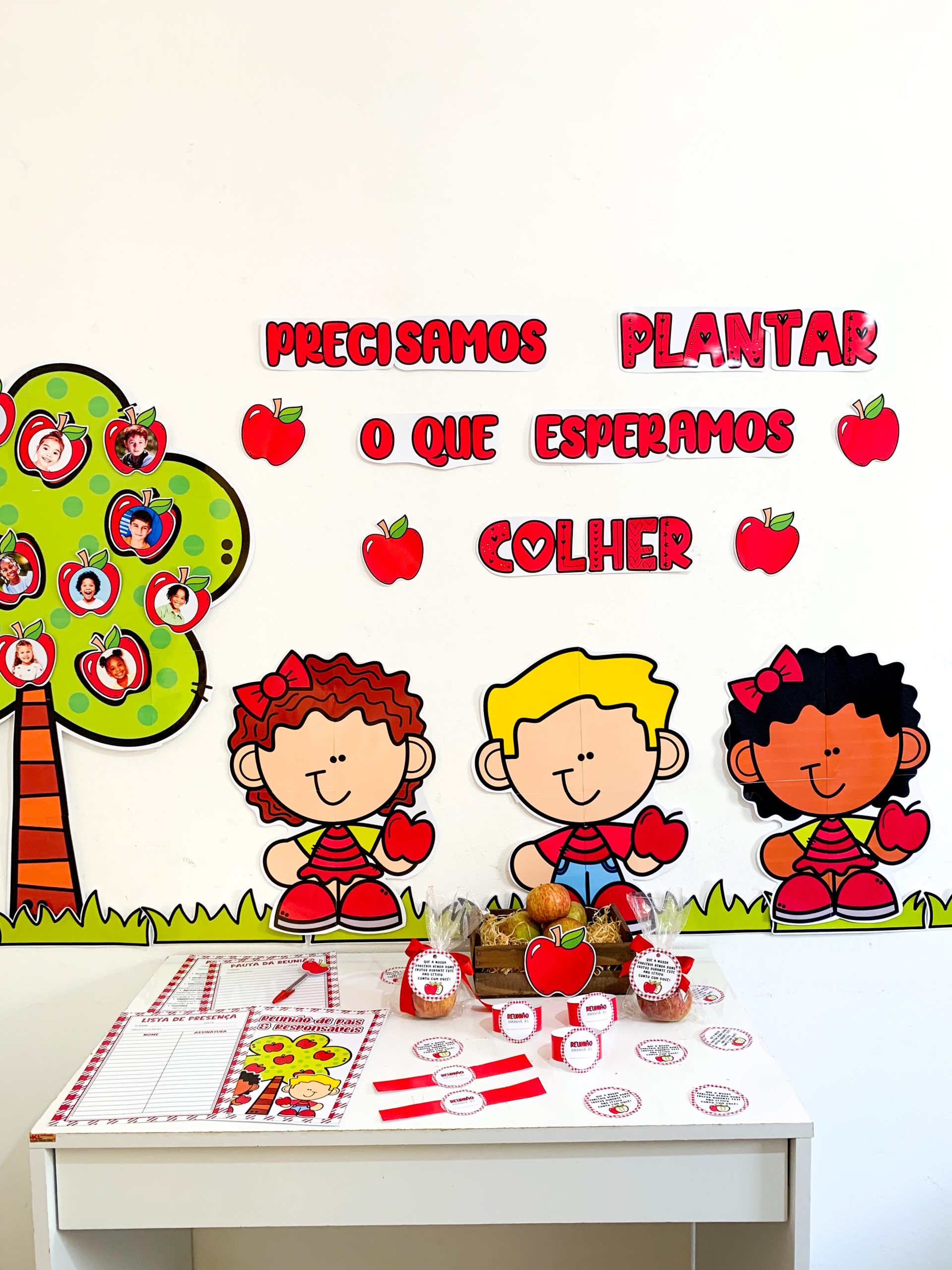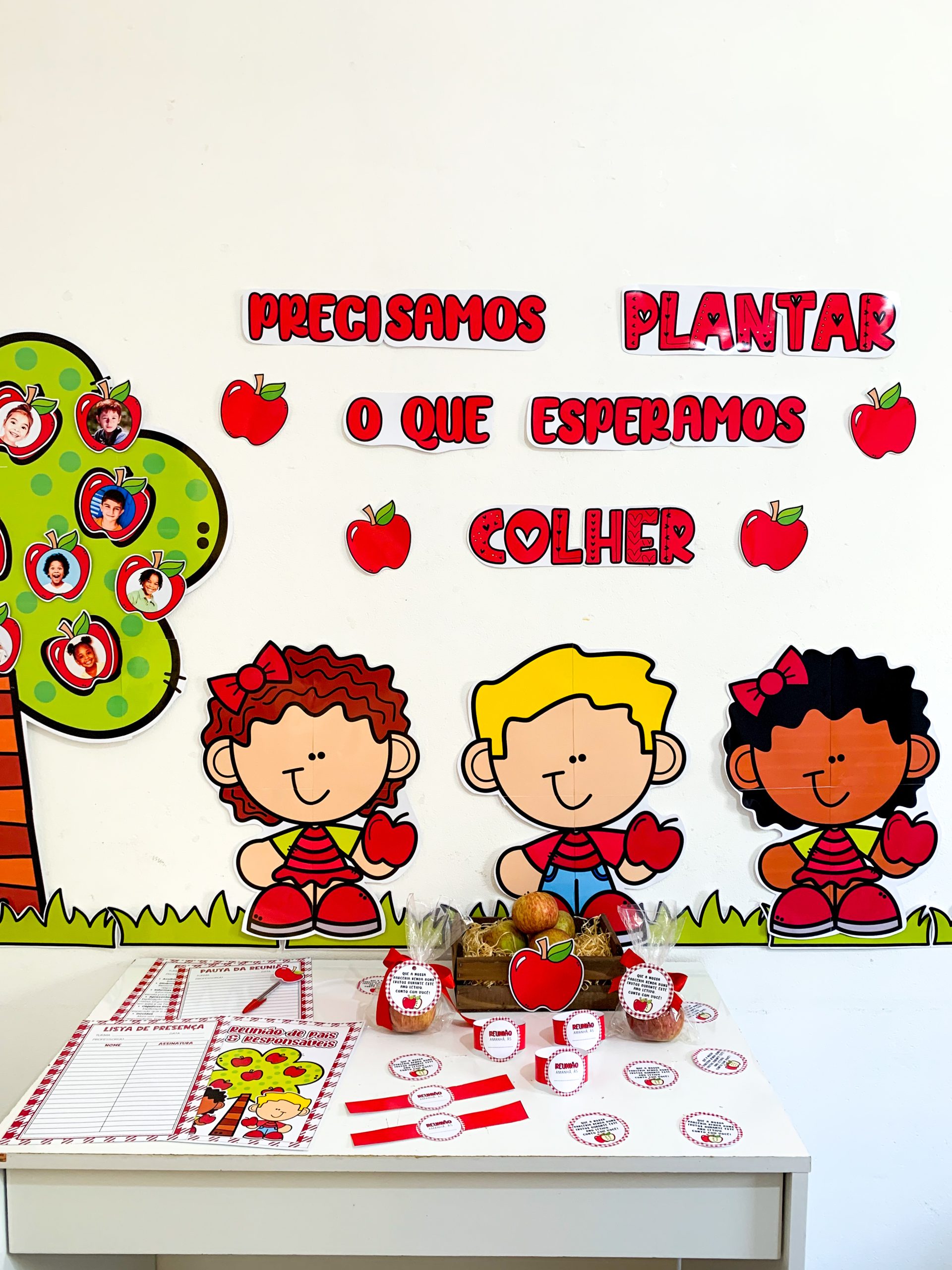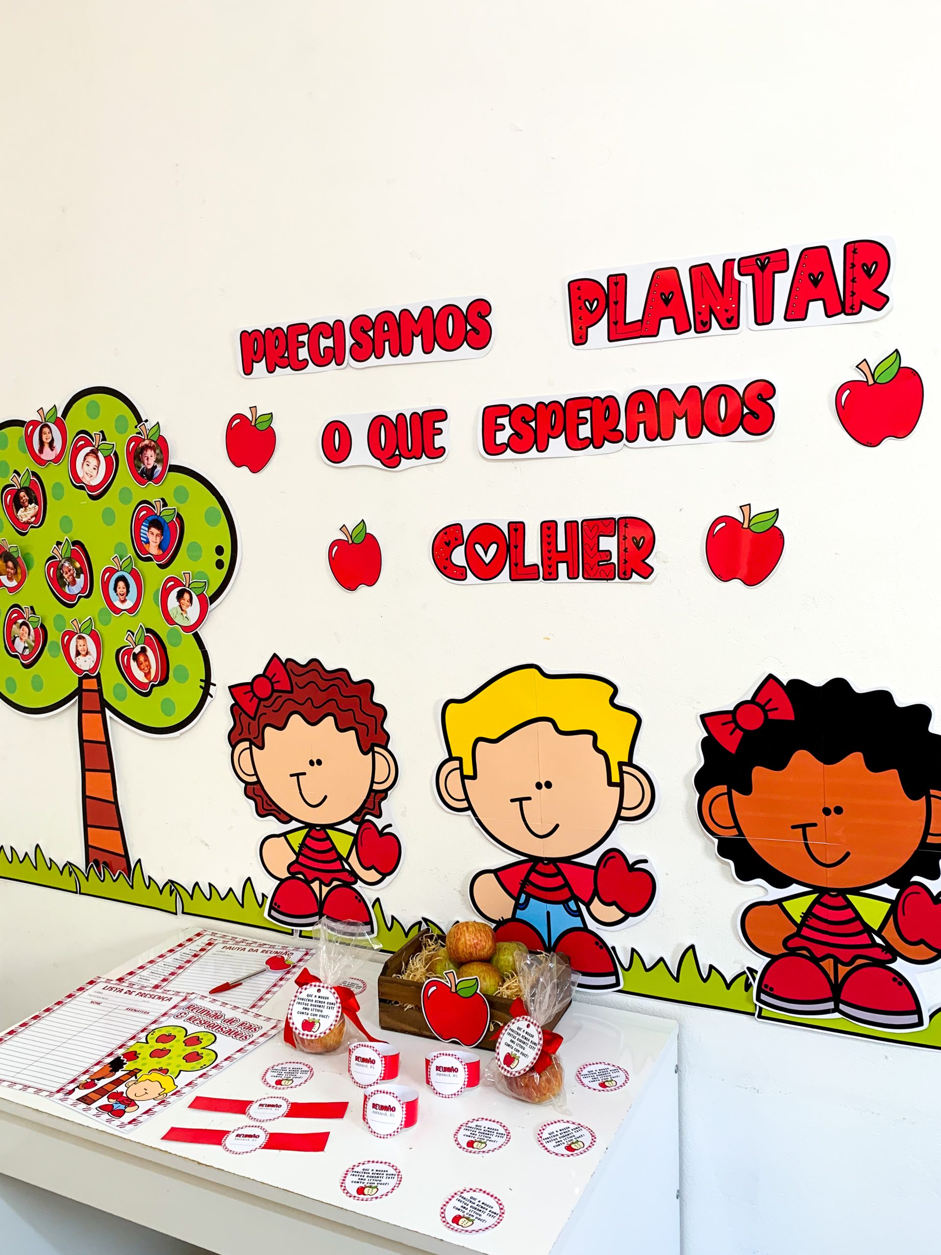 Kit Reunião: Colhendo Frutos para utilizar em turmas de Educação Infantil. Material super completo e com itens editáveis para você tornar o momento da reunião muito mais envolvente e acolhedor. O kit inclui: Painel decorativo ampliado Lista de presença Lista de pauta da reunião Bracelete com lembrete da reunião Tag para lembrancinha, maçã Maçã editável para você adicionar a foto da criança. O arquivo Vai em PDF pronto para impressão.