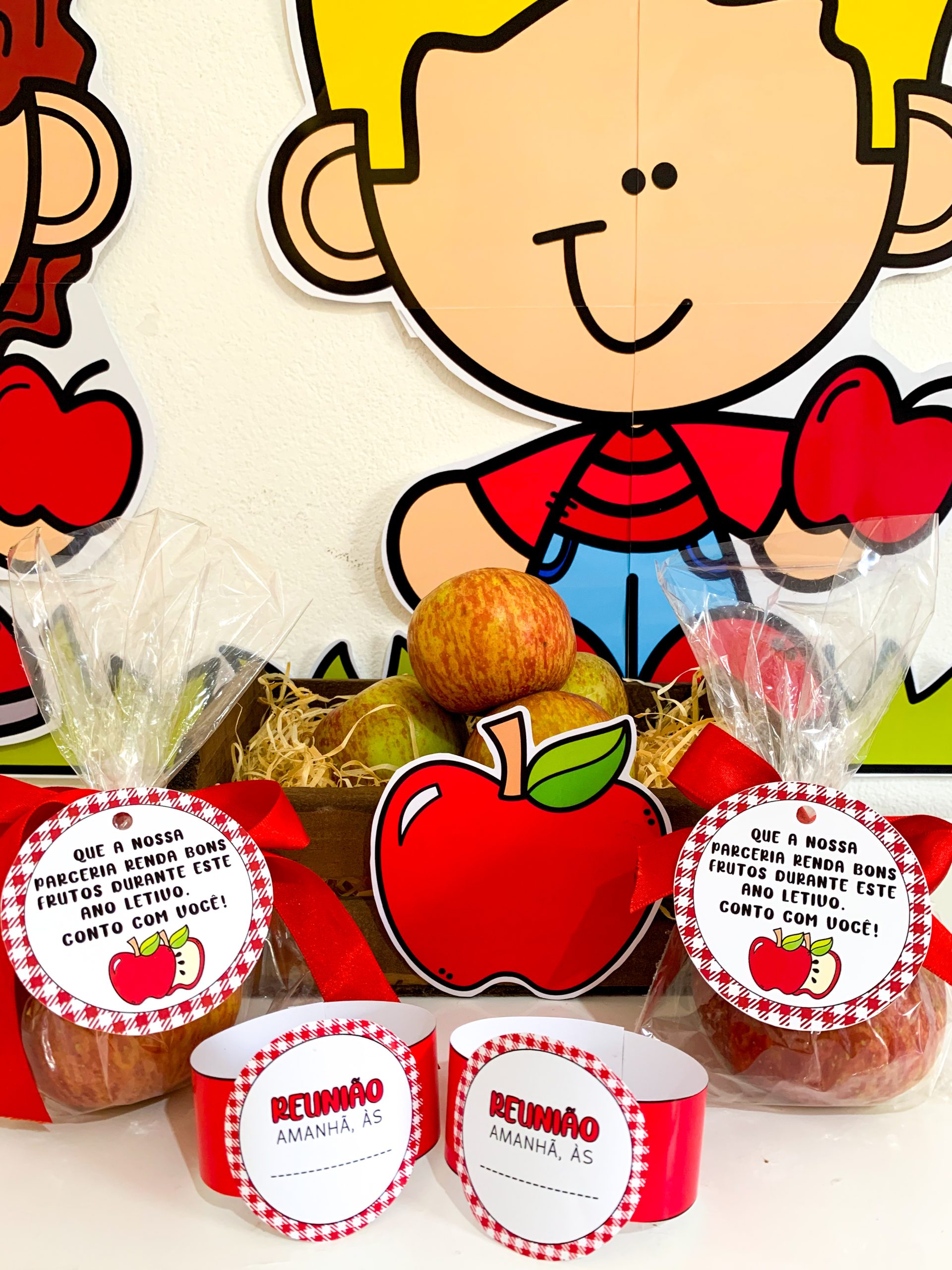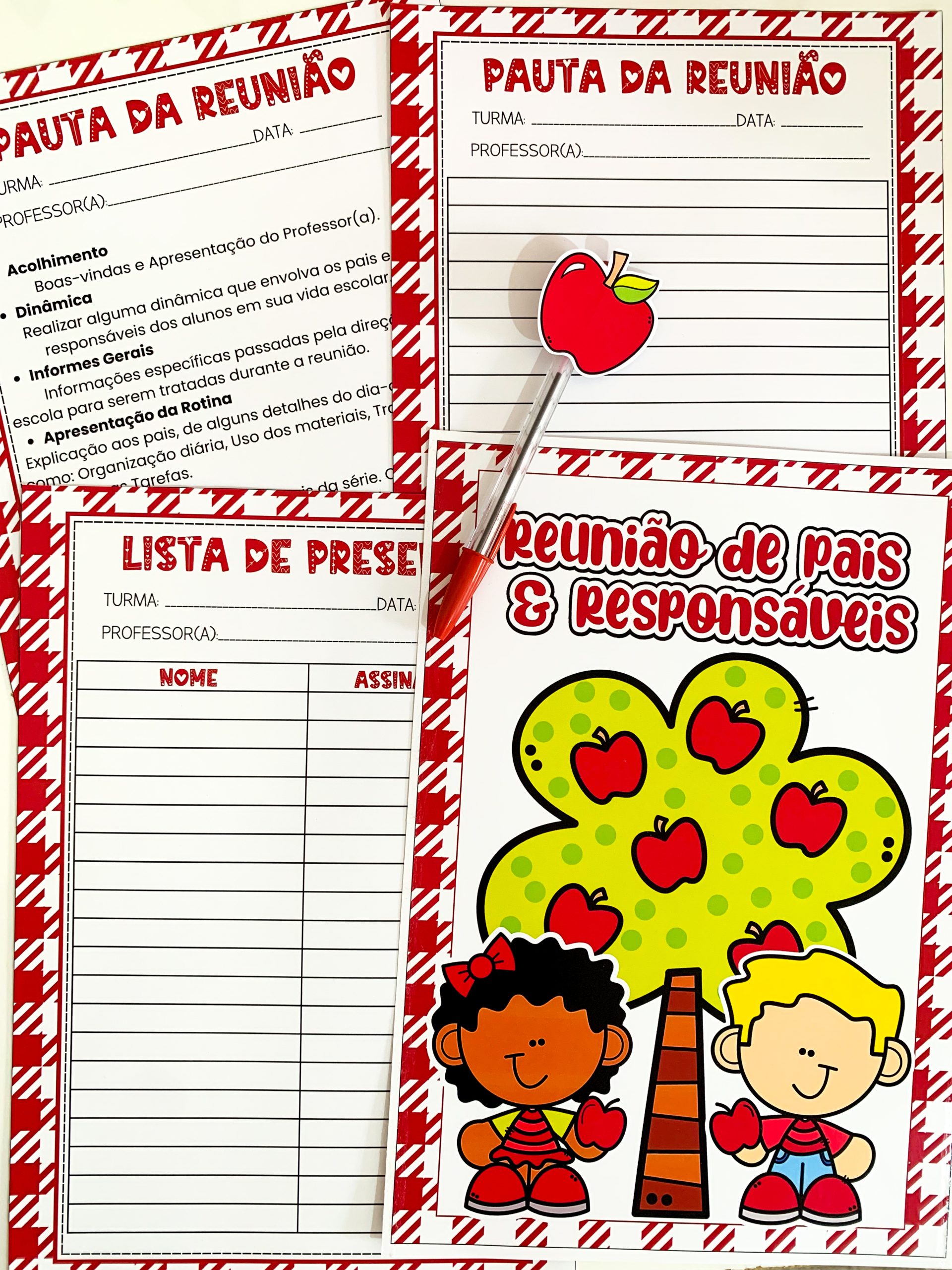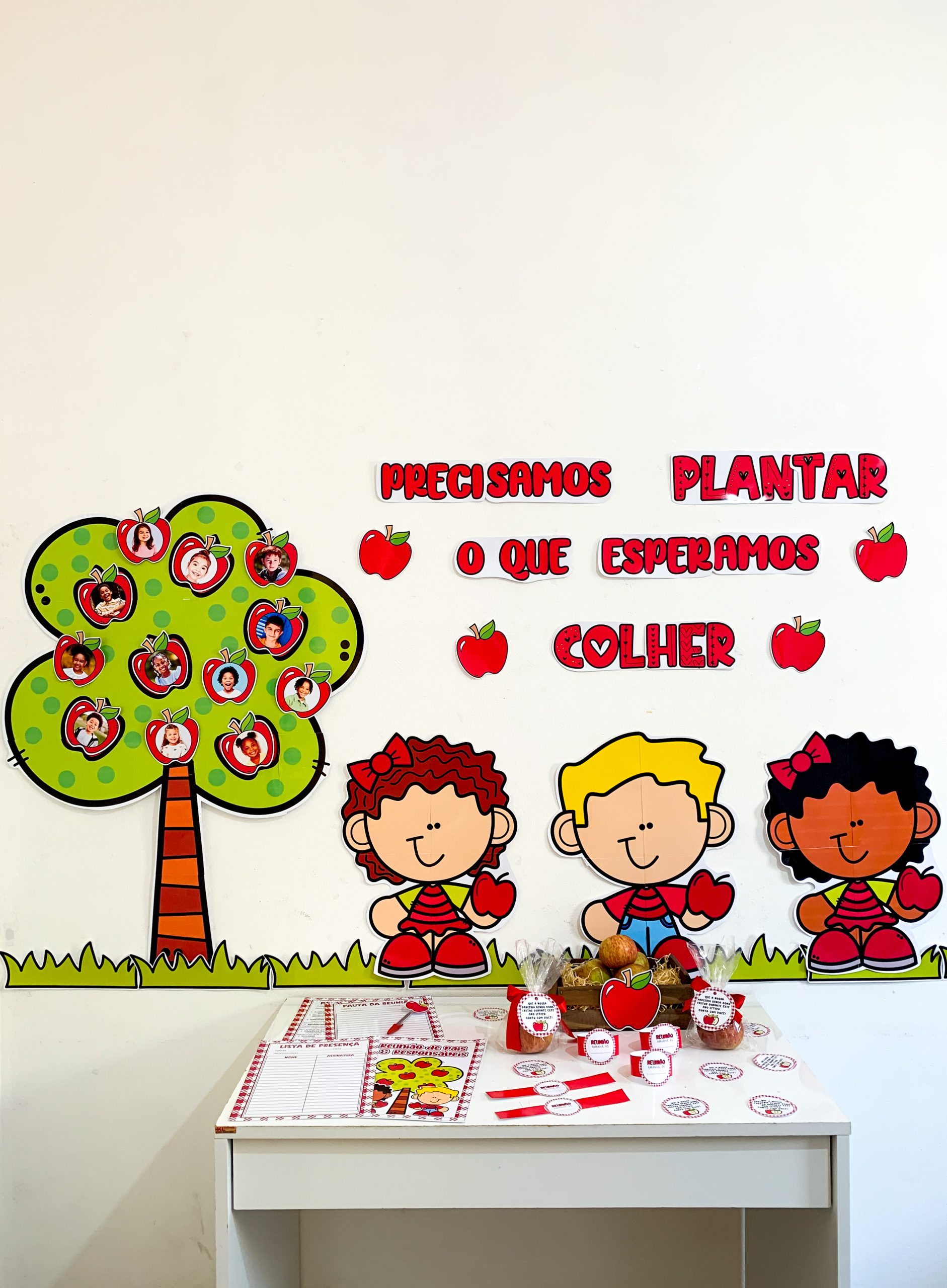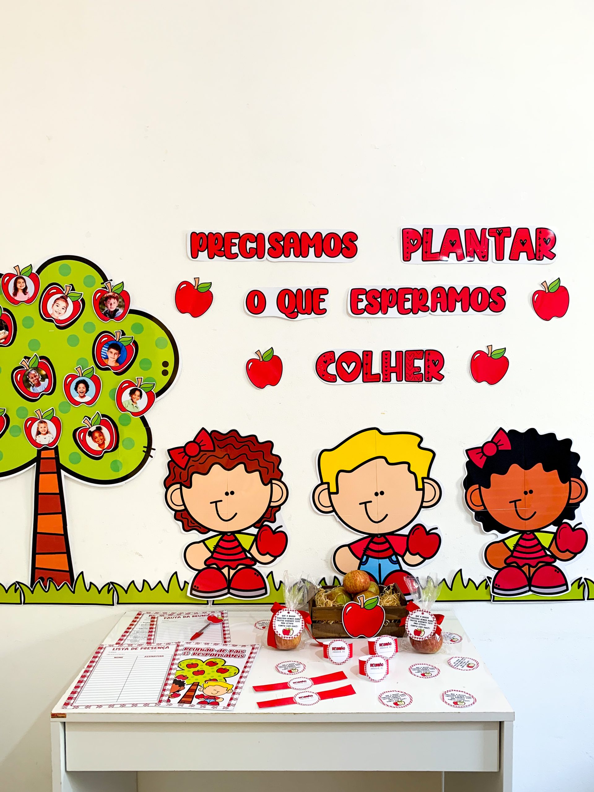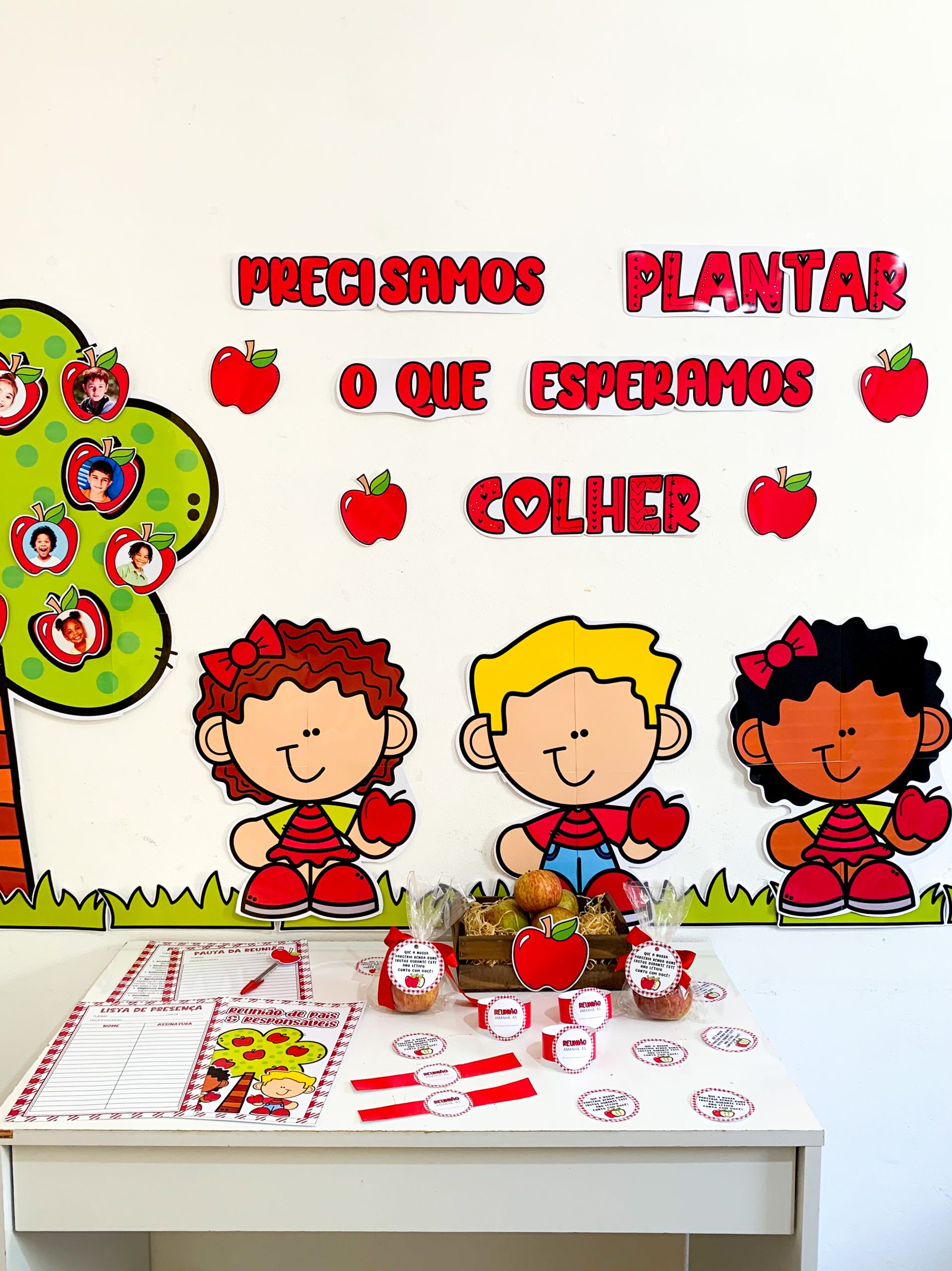 Kit Reunião: Colhendo Frutos para utilizar em turmas de Educação Infantil. Material super completo e com itens editáveis para você tornar o momento da reunião muito mais envolvente e acolhedor. O kit inclui: Painel decorativo ampliado Lista de presença Lista de pauta da reunião Bracelete com lembrete da reunião Tag para lembrancinha, maçã Maçã editável para você adicionar a foto da criança. O arquivo Vai em PDF pronto para impressão.